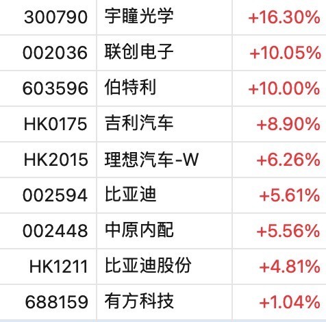 比亚迪智驾概念股维持强势。截至发稿,吉利汽车-W(00175.HK)、理想汽车-W(02015.HK)、比亚迪股份(01211.HK)分别上涨7.44%、5.01%、3.48%。A股比亚迪(002594)一度大涨超6%,随后涨幅回落至5.61%。伯特利、联创电子涨停,宇瞳光学、中原内配、有方科技上涨。