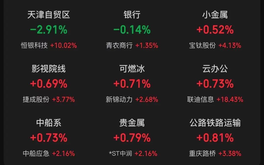 板块方面,DeepSeeK概念、低辐射玻璃(LOW_E)、光伏设备、华为欧拉、IT服务、智谱AI、海南自贸、算力租赁、BC电池等板块涨幅靠前;小金属、影视院线、可燃冰、云办公、中船系、贵金属、公路铁路运输等涨幅靠后;天津自贸区、银行板块下跌。